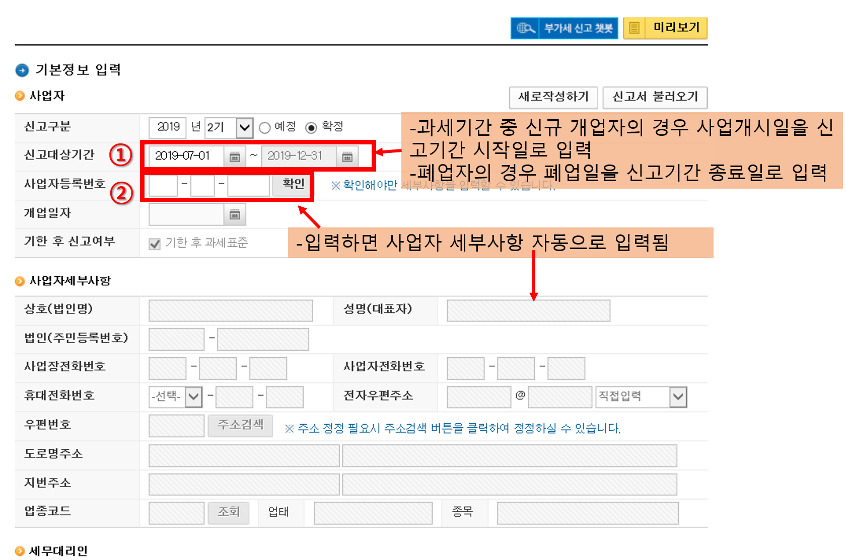 자동으로 입력되어 있으나, 신규개업이나 폐업의 경우 날짜 수정