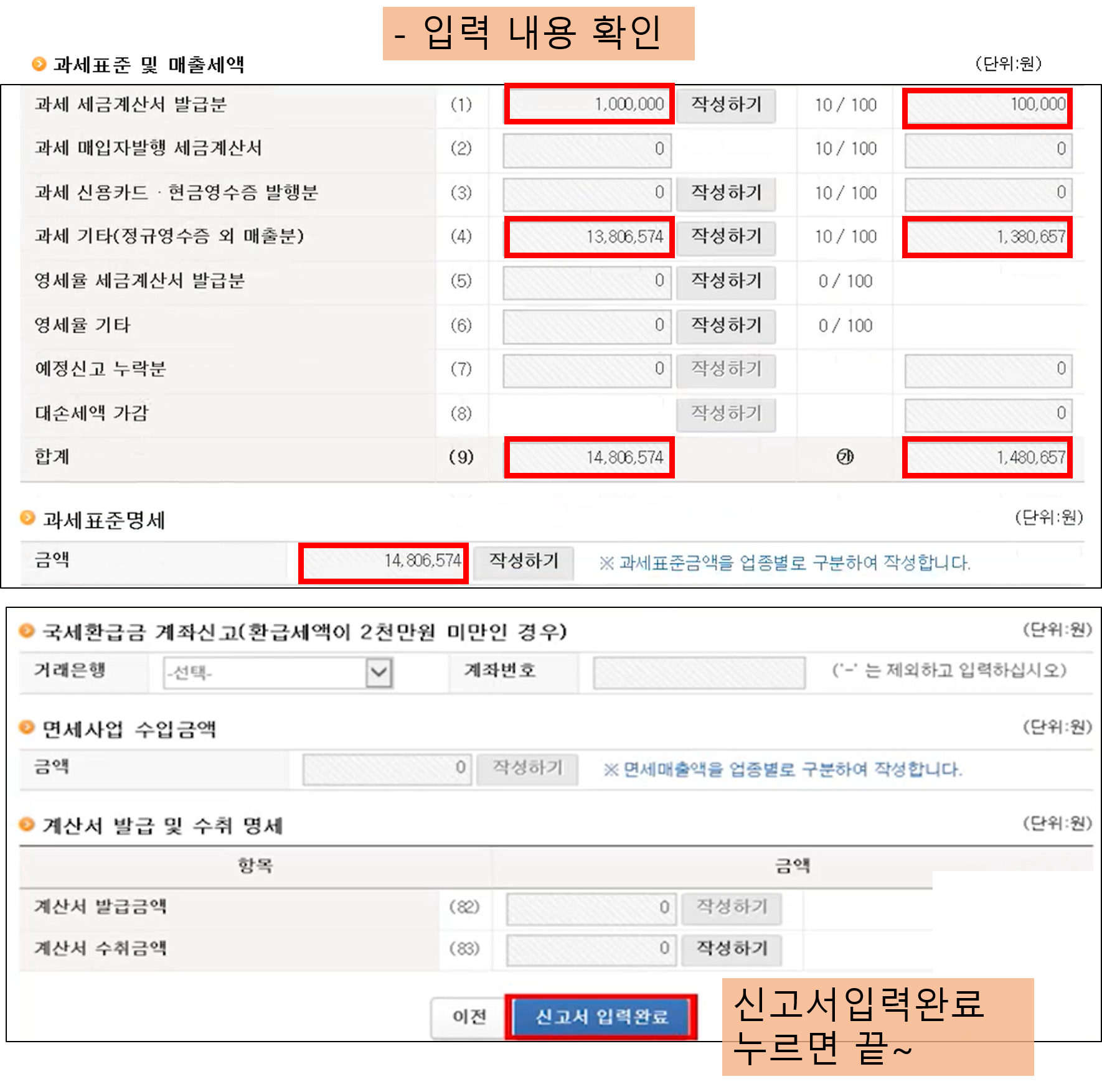 입력한 금액이 맞는시 다시한번 확인하고 '신고서 입력완료'를 누르면 부가가치세 신고는 완료가 됩니다.