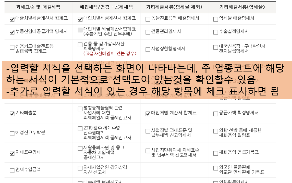 - 입력할 서식을 선택해주는 화면으로 기본적으로 선택이 되어있고, 추가 입력할 서식이 있으면 해당 항목 체크