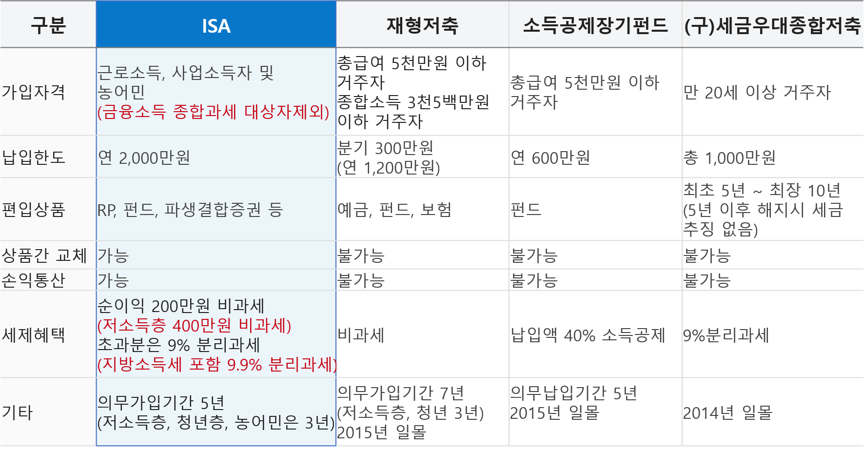 ISA( Indivisual Savings Account)란 ISA라는 하나의 바구니에 원하는 상품을 골고루 담고, 그 상품에서 발생한 금융소득 중200만 원(서민형 농어민형은 400만원)까지는 비과세, 200만원 초과되는 금액은 분리과세를 하는 상품을 말합니다.