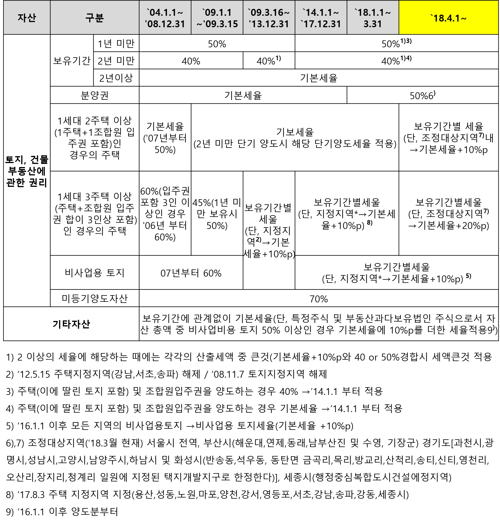 양도소득세 세율 변동 연혁도 알아보았는데요, 시간이 지날수록 과세구간도 세분화되고 세율도 강화되는 경향입니다.