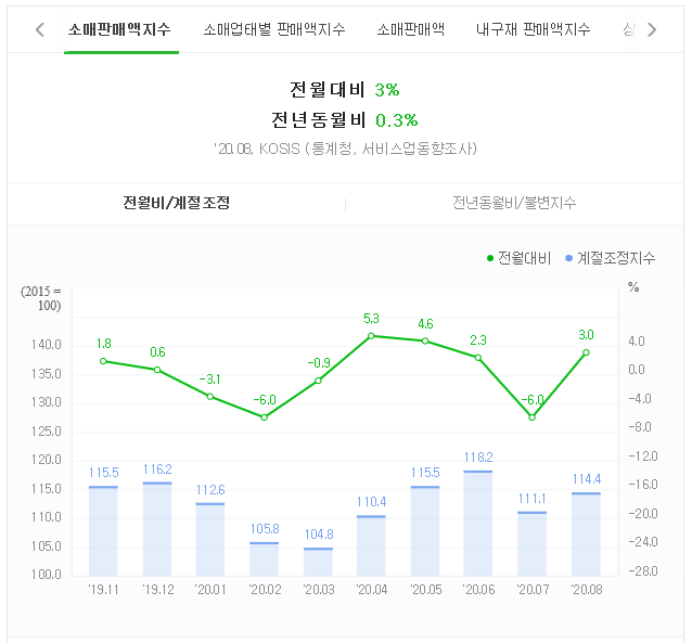 2020년 8월 소매판매액지수를 보면 114.4입니다. 이는 2015년에 비에 14.4% 성장을 했다는 것을 알 수 있습니다.