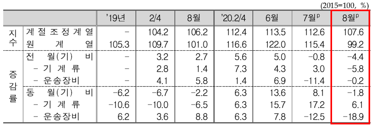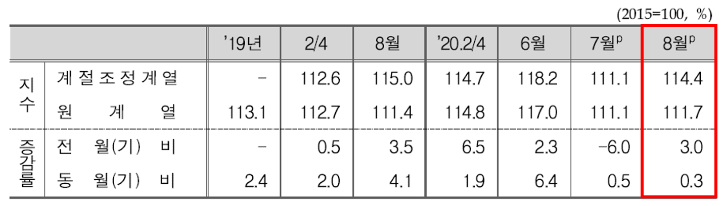 2020년 8월 산업생산지수를 보면 107.6입니다. 이는 2015년에 비에 7.6% 투자액이 증가했다는 것을 알 수 있습니다.
