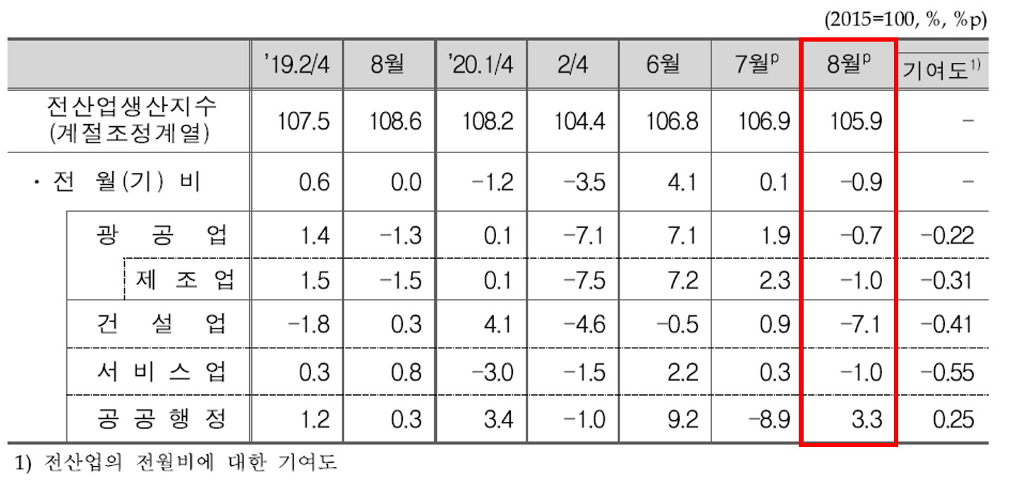 2020년 8월 산업생산지수를 보면 105.9입니다. 이는 2015년에 비에 5.9% 성장을 했다는 것을 알 수 있습니다.