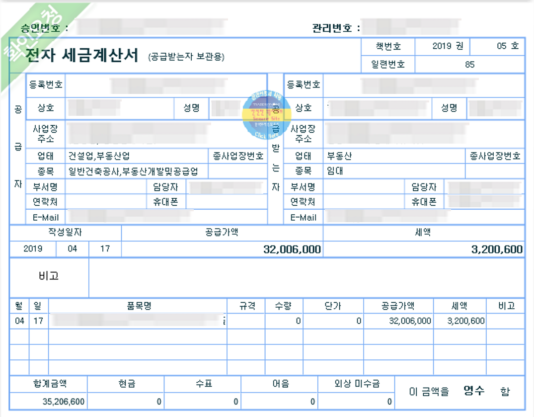 최초 분양받은 자는 세금계산서가 사업자번호로 발급이 되므로 계약금, 중도금 납부 시마다 시행사가 전자세금계산서를 발행합니다. 이 전자세금계산서는 메일로 오게 됩니다.