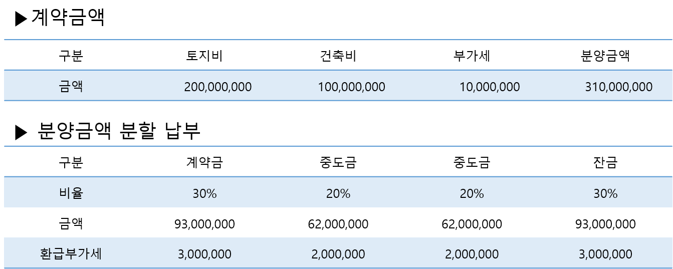 분양을 받게 되면 먼저 계약금을 납후하고, 공사 중간중간에 중도금을 납부하고 건물이 준공이 떨어지고 잔금을 입금할때 납부금액에 해당하는 부가세를 나누어서 받게 됩니다.