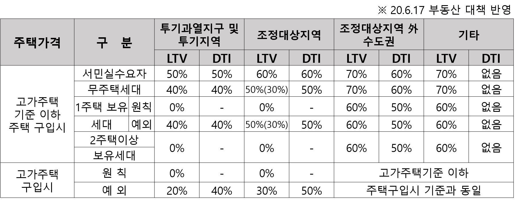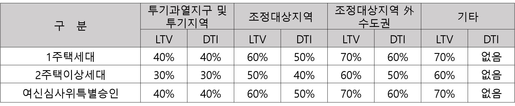 ※ 투기지역, 투기과열지구의 경우 시가 9억 원 이하 LTV 40%적용, 시가 9억원 초과 LTV 20% 적용, 시가 15억 원 초과 아파트를 구입하는 목적의 주택담보대출은 금지