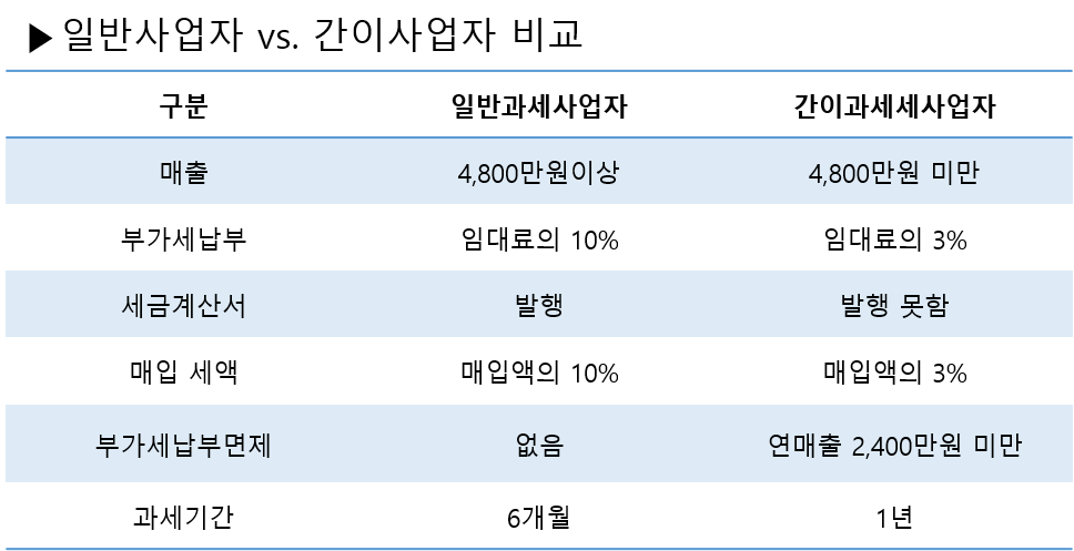 아래표는 일반과세, 간이과세 사업자를 비교한 자료입니다.