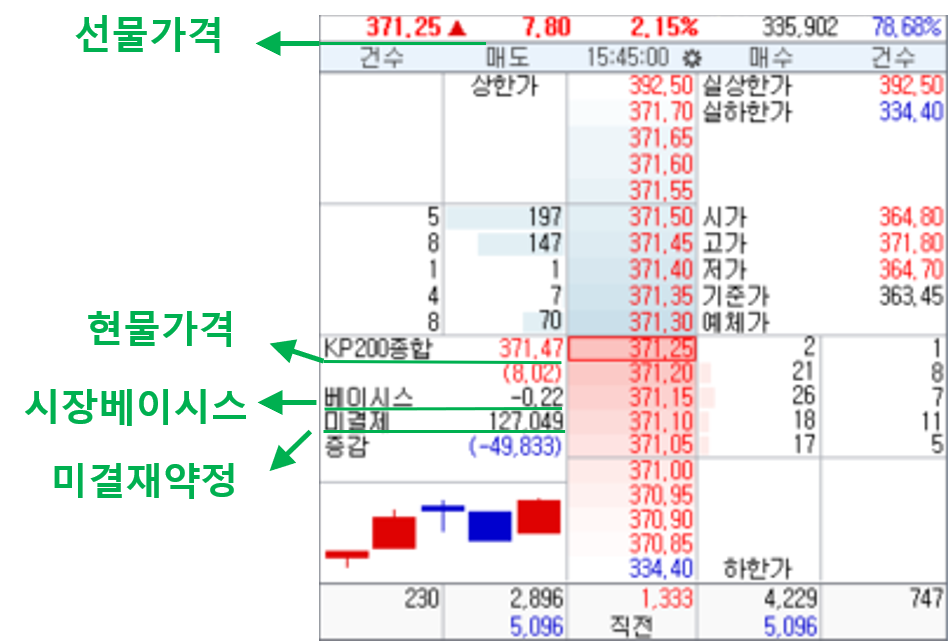 선물시장가격은 선물시장에서 거래되는 선물의 가격을 말하는데, 이는 선물시장의 거래대상물인 코스피200 지수가 만기일에 얼마가 될 것인가 하는 판단을 기준으로 선물시장에서 거래되는 선물가격을 의미합니다.