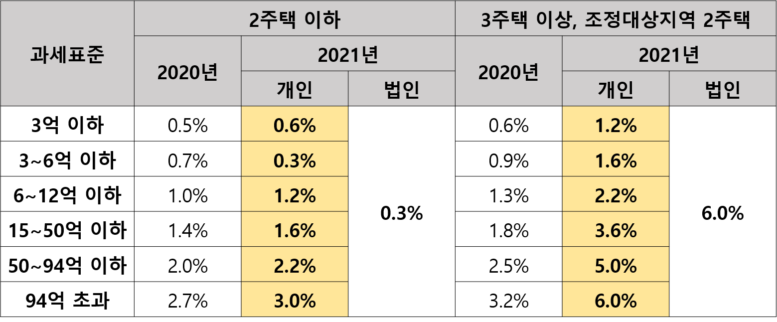 3주택 이상 및 조정대상지역 2주택자는 과표 구간별로 세울이 0.6%~2.8% 상승됩니다.