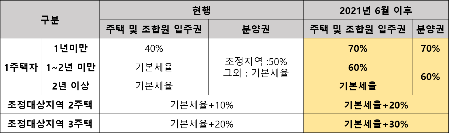 현재 조정대상지역 내 분양권에 대해 보유기간과 상관없이 50% 세율을 적용하고 있습니다. 내년 6월부터는 지역에 상관 없이 1년 미만 보유시 70%, 그 외의 경우에는 60% 세율을 적용합니다.