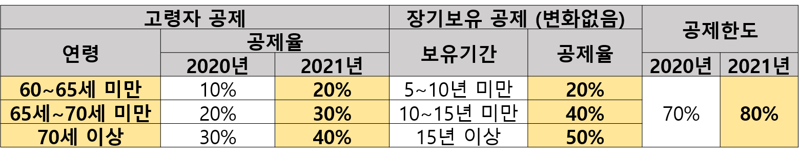 장기보유 공제와 합산한 합산 공제율의 한도도 10% 올라 최대 80%가 됩니다.