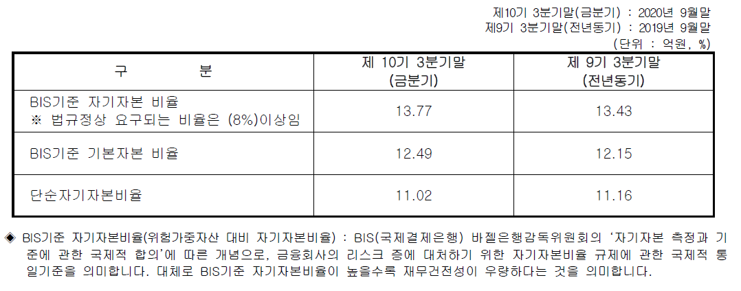 은행의 건전성을 점검하는 핵심지표로. BIS에서는 은행들에게 BIS비율 8% 이상을 유지하도록 권고하고 있습니다.