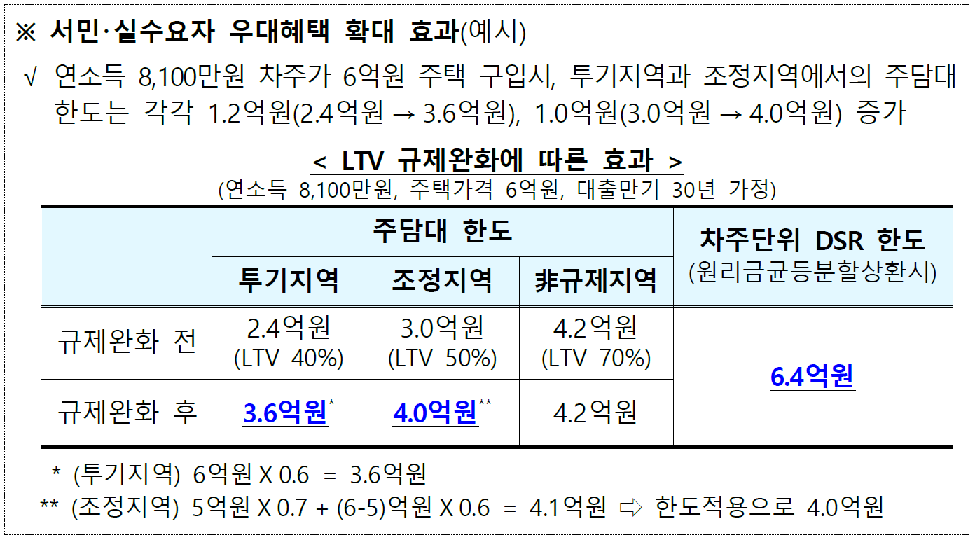 금융위에서는 금번 대출규제 완화로 대다수의 서민 실수요자의 경우 대출한도가 확대될 것으로 기대하고 있습니다.