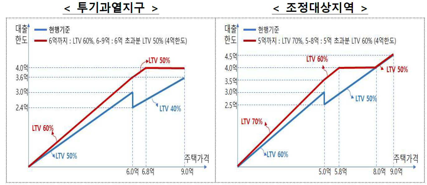 -. 주택가격 기준 (투기 6 →9억원, 조정 5→8억원) 상향