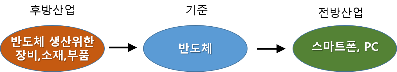 다시말해 자사를 기준으로 제품 소재나 원재료 공급 쪽에 가까운 업종을 후방산업, 최종 소비자와 가까운 업종을 전방산업이라고합니다.