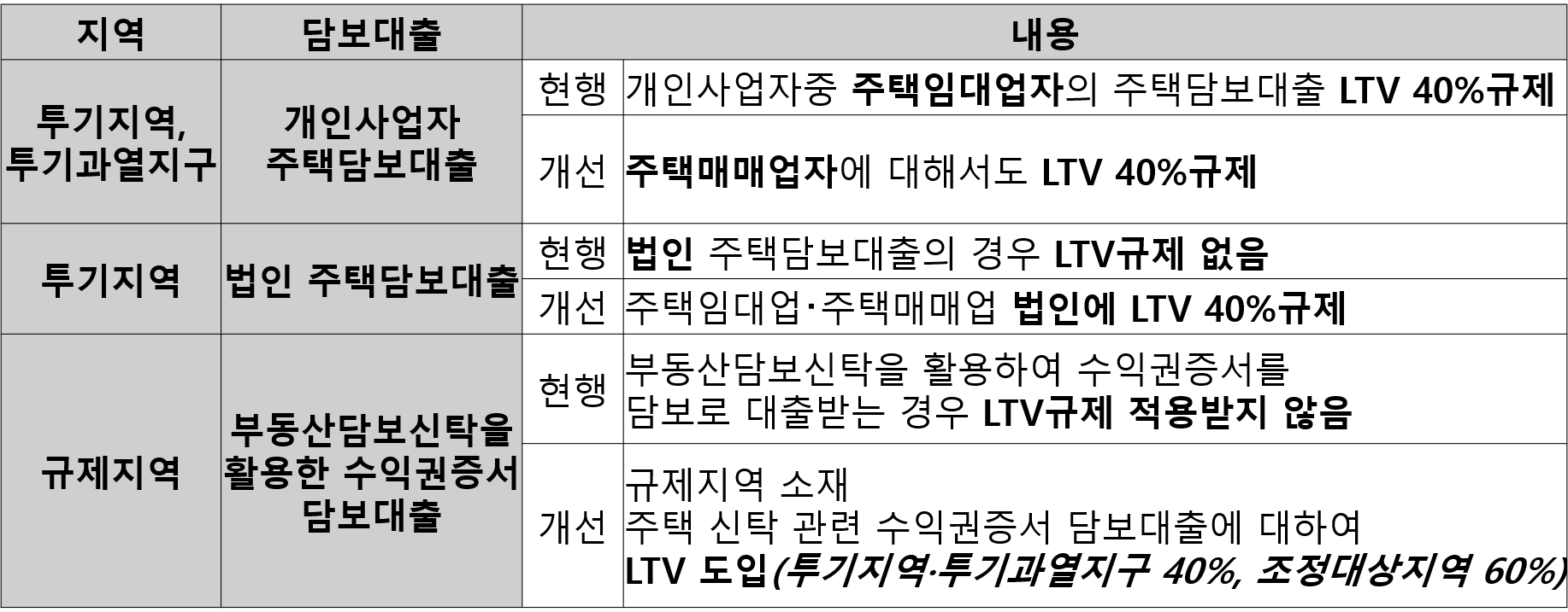 - 지역별로 개인 사업자, 법인사업자 및 부동산신탁을 활용한 수익증권서 담보대출 규제가 강화됨