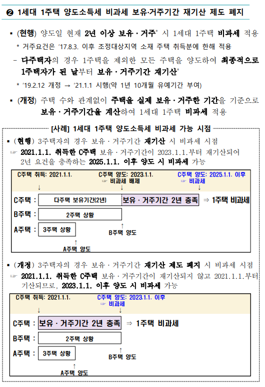 2. 1세대 1주택 양도세 비과세 보유, 거주기간 재기산 제도를 폐지
