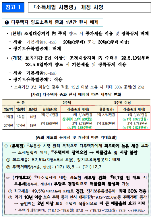 이번 소득세법 시행령 개정으로 과도한 세부담과 규제가 완화 됨으로써 매물 출회를 유도하여 부동산 시장을 안정화 하는 한편 거주이전 관련 국민들의 불편이 해소 될것으로 기대 됩니다.