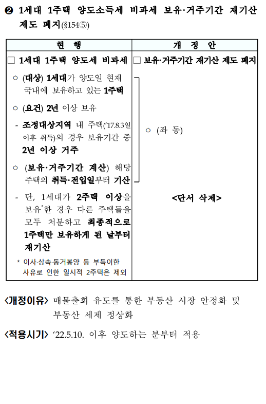 2. 1세대 1주택 양도세 비과세 보유, 거주기간 재기산 제도를 폐지
