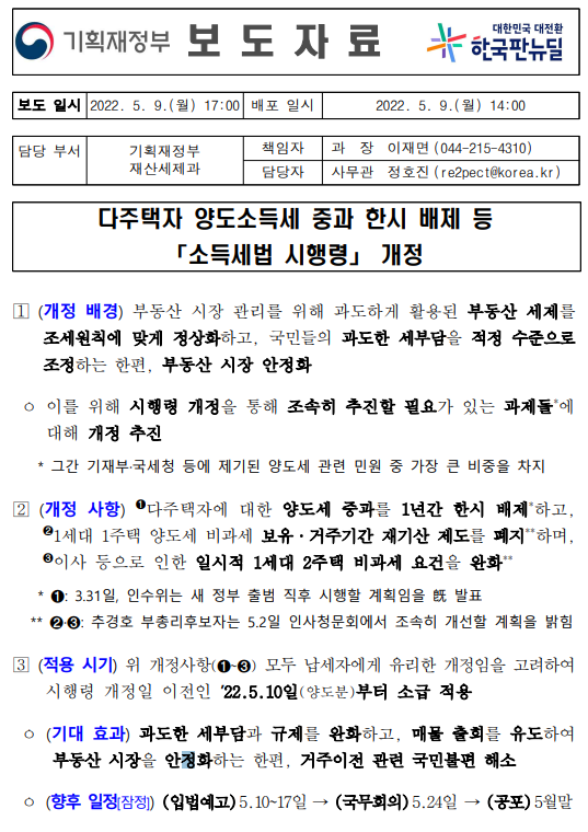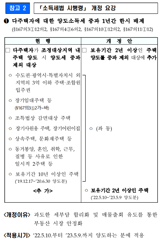 22년 5월 9일 다주택자 양도소득세 중과 한시 배제 등에 관한 소득세법 시행령이 개정 되었습니다.