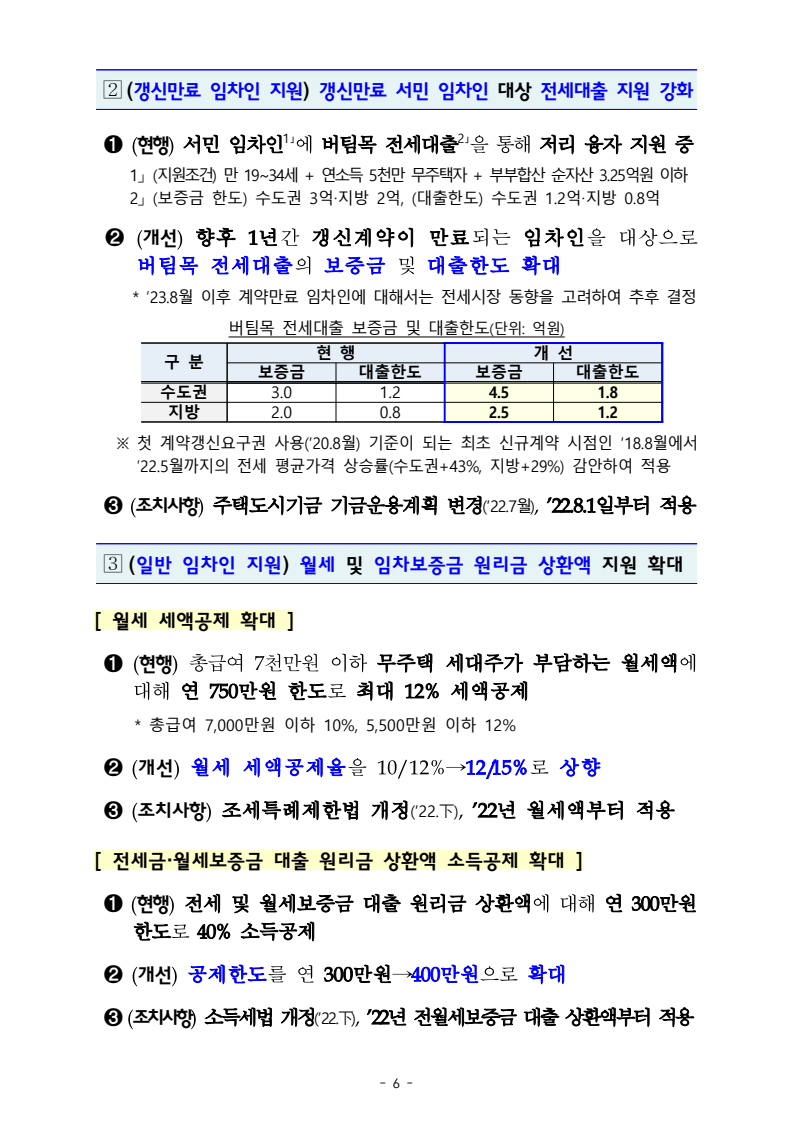 - 향후 1년간 갱신계약이 만료되는 임차인을 대상으로 버팀목 전세대출의 보증금 및 대출 한도 확대