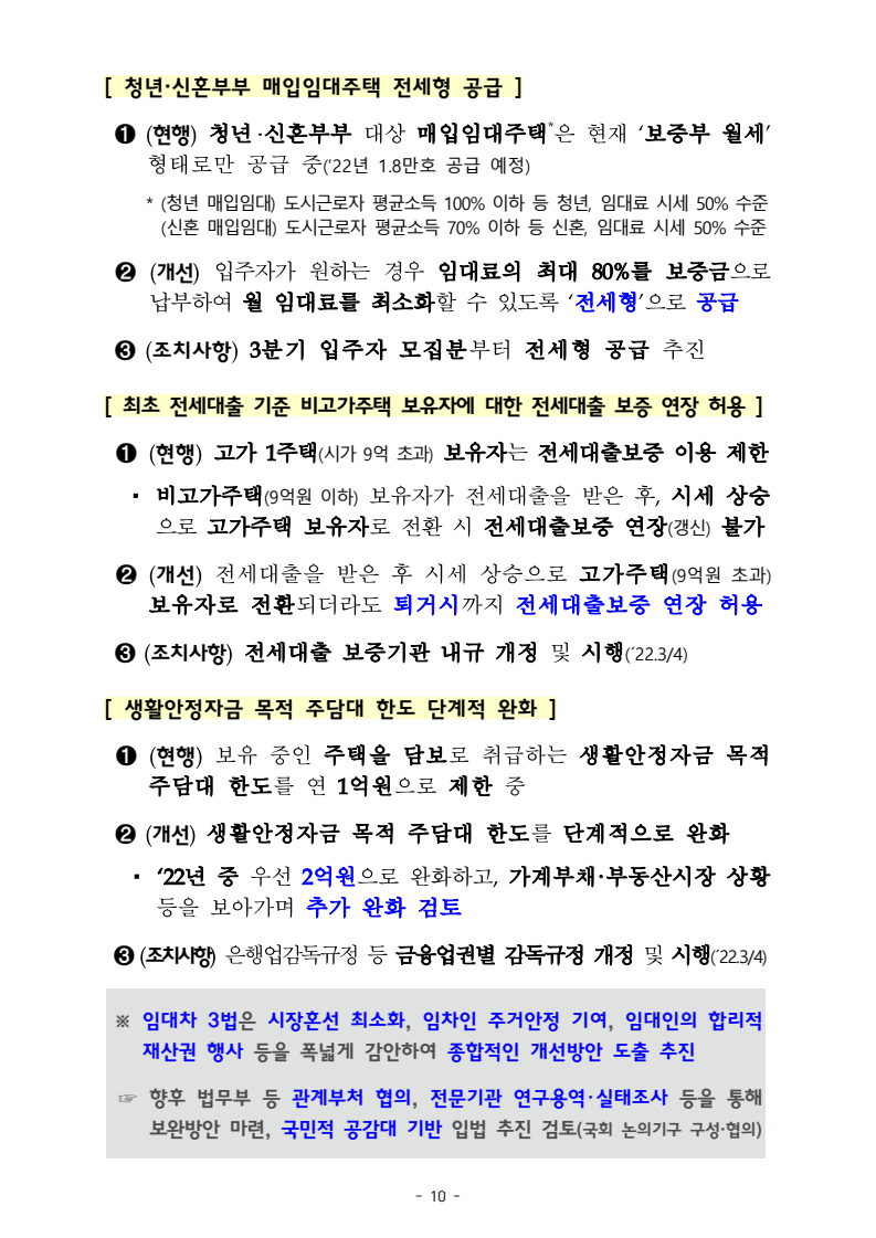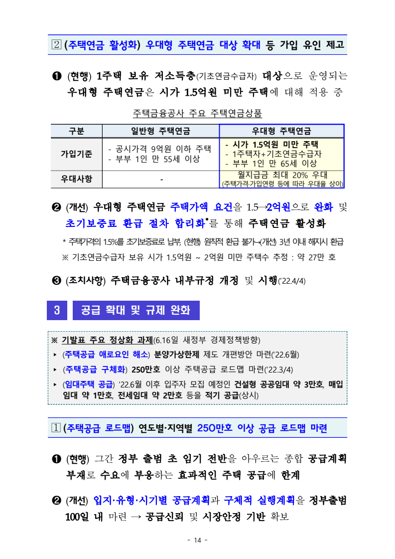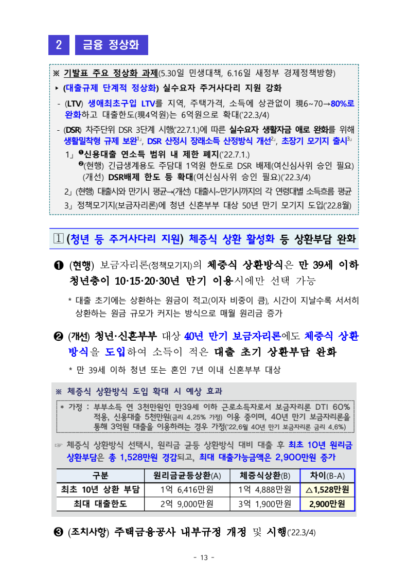 - 생활안정자금 목적 주담대 한도를 단계적으로 완화 `22년 중 우선 2억원으로 완화하고, 가계부채,부동산시장 상황등을 보아가며 추가완화 검토