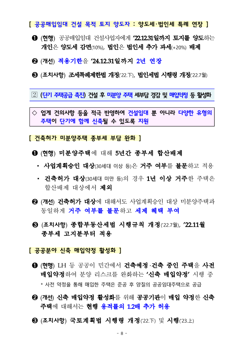 -공공매입임대 건설사업자에게 `24.12.31일 까지(2년연장) 토지를 양도하는 개인은 양도세 감면(10%), 법인은 법인세 추가 과세(+20%)배제
