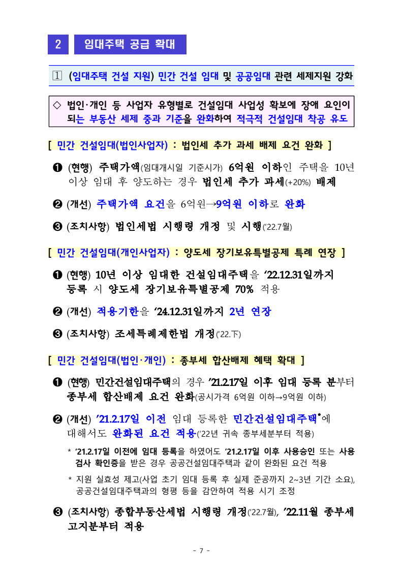 1.(임대주택 건설 지원) 민간 건설 임대 및 공공임대 관려니 세제지원 강화