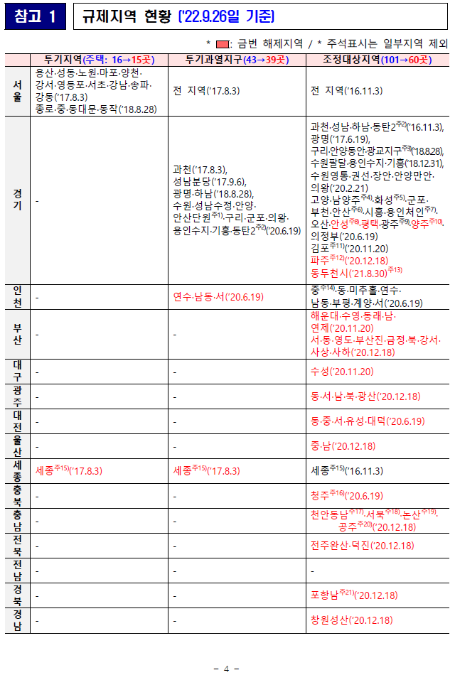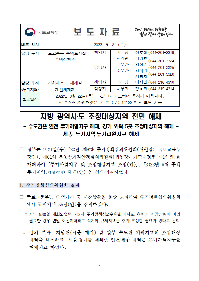 금일 9/21 국토교통부에서는 지방 광역시,도 조정대상지역 전면 해제에 관련해서 보도 자료를 내놓았습니다.