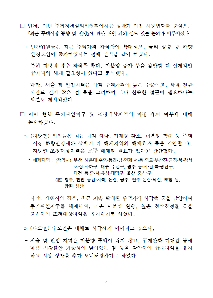 최근 주택가격이 하락하는 시장상황을 고려하여 다음과 같이 조정대상지역을 해제하기로 했습다고 합니다.
