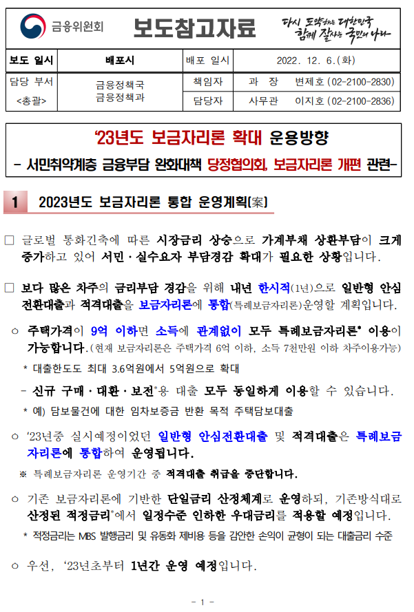 22.12.6 (화) 금융위원회에서 특례보금자리론에 대한 보도 자료를 배포했습니다.