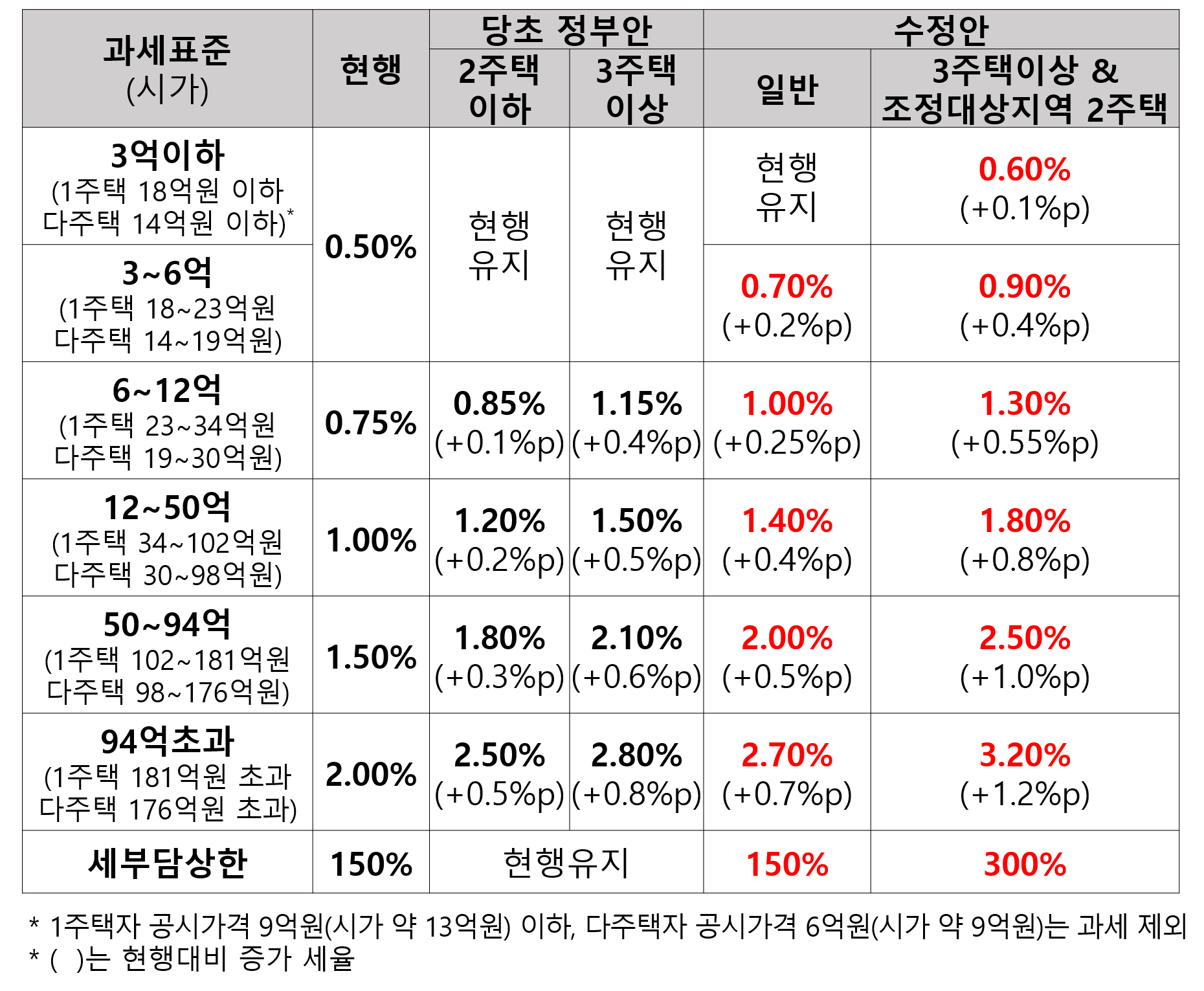 -3주택이상 보유자와 조정대상지역 2주택 보유자를 동일하게 추가 과세, 현행대비 +0.1~1.2%p 세율 인상