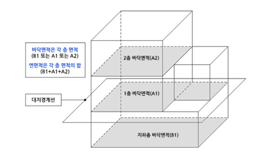 정리하면, 대지면적은 대지의 면적을, 건축면적은 건출물이 있는 바닥면적, 바닥면적은 각 층의 면적, 연면적은 건물 내 바닥 면적의 합입니다.