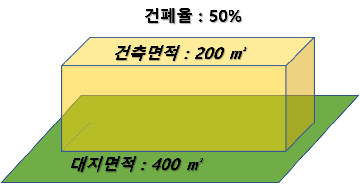 건폐율 : 대지에 건출물의 그림자가 덮고 있는 비율 입니다. 즉, 대지면적에 대한 건축물의 비율