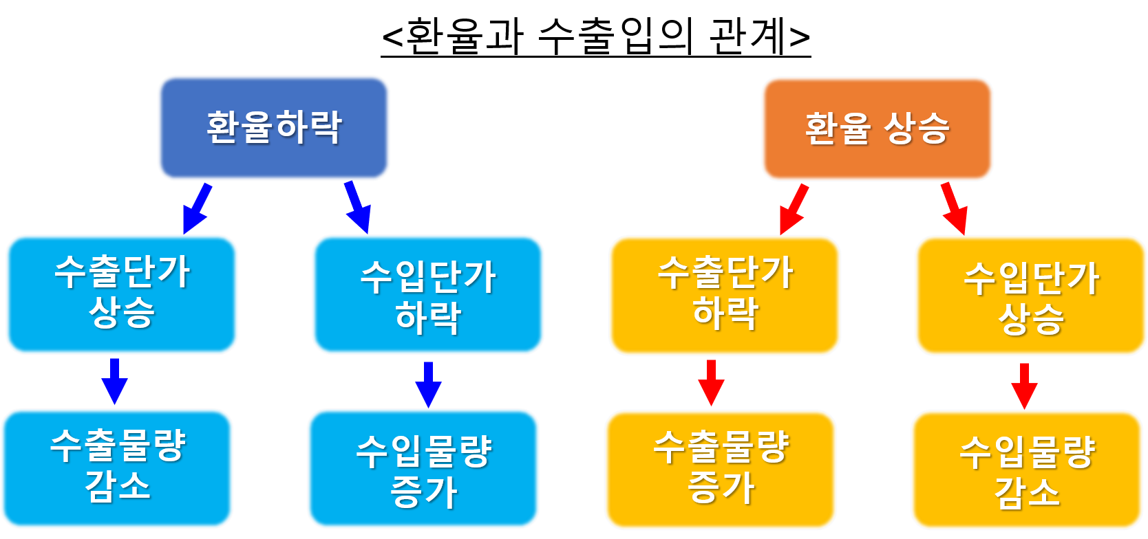 - 환율 상승 → 수출단가 하락 → 수출물량 증가