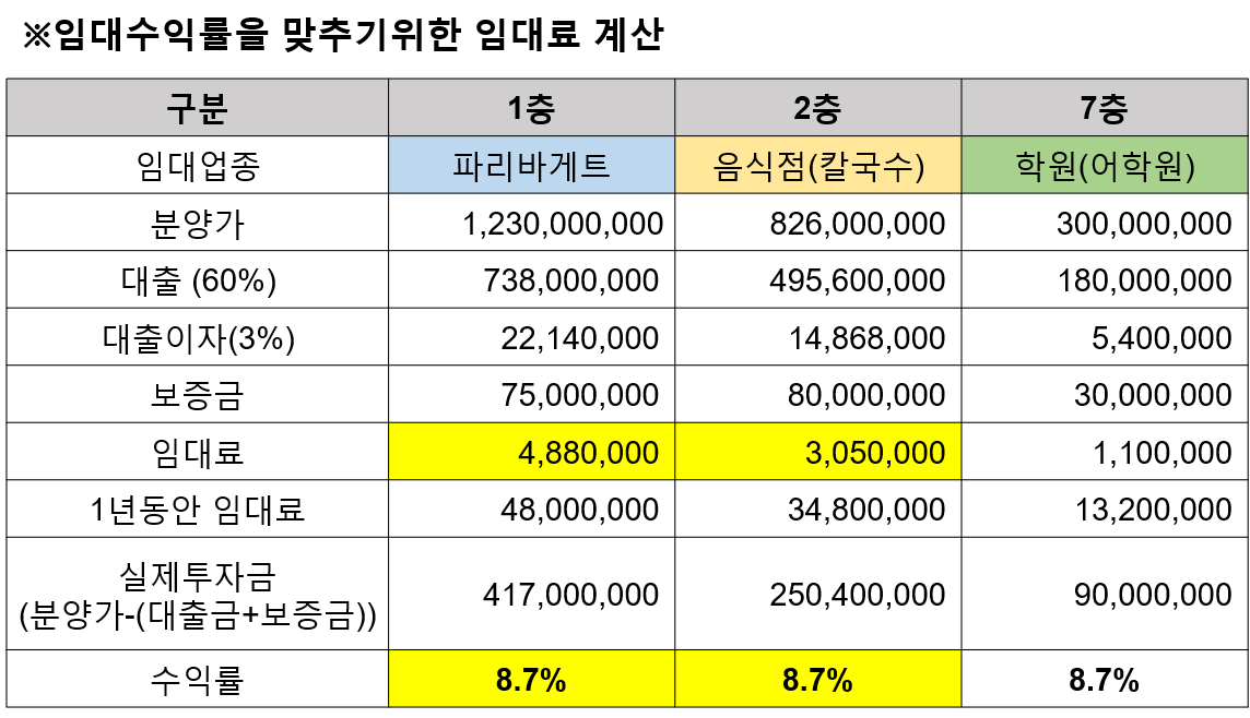 아래 표는 7층과 임대수익률을 같게 맞추기 위한 임대료를 계산한 것입니다.
