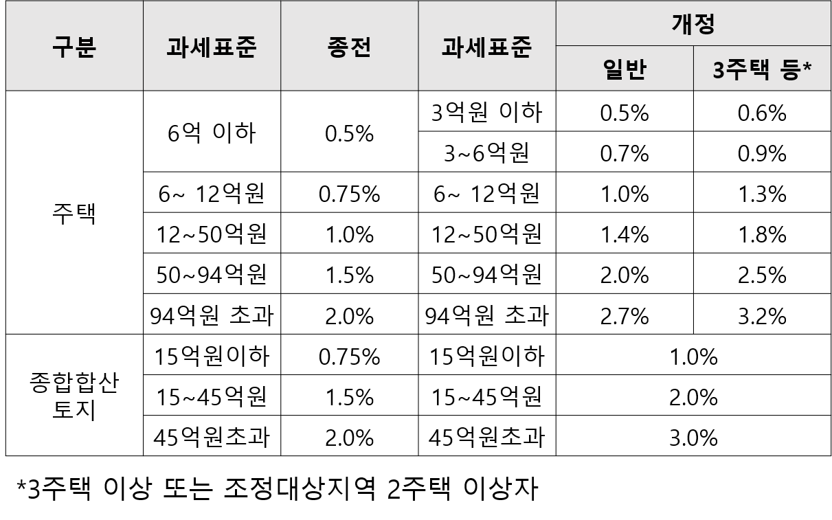 아래 표는 부동산 정책에 따라 종합부동산세의 바뀐 세율입니다.