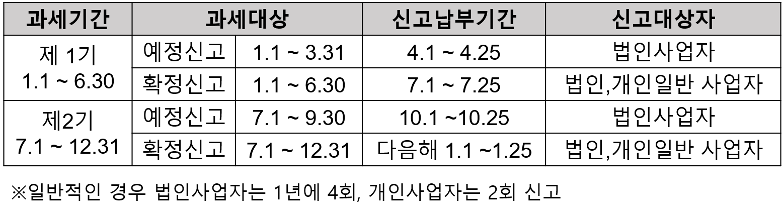 - 개인사업자 (일반과세자) 중 사업부진자, 조기 환급 발생자는 예정신고와 예정 고시 세액 납부 중 하나를 선택하여 신고 또는 납부할 수 있습니다.