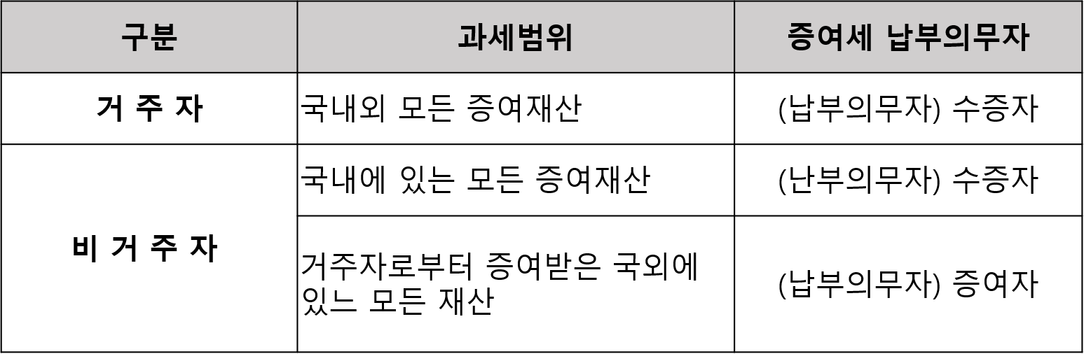 ◎ 수증가가 증여일 현재 거주자인지 여부에 따라 과세 범위 및 증여세 납부의무자에 차이가 있습니다.