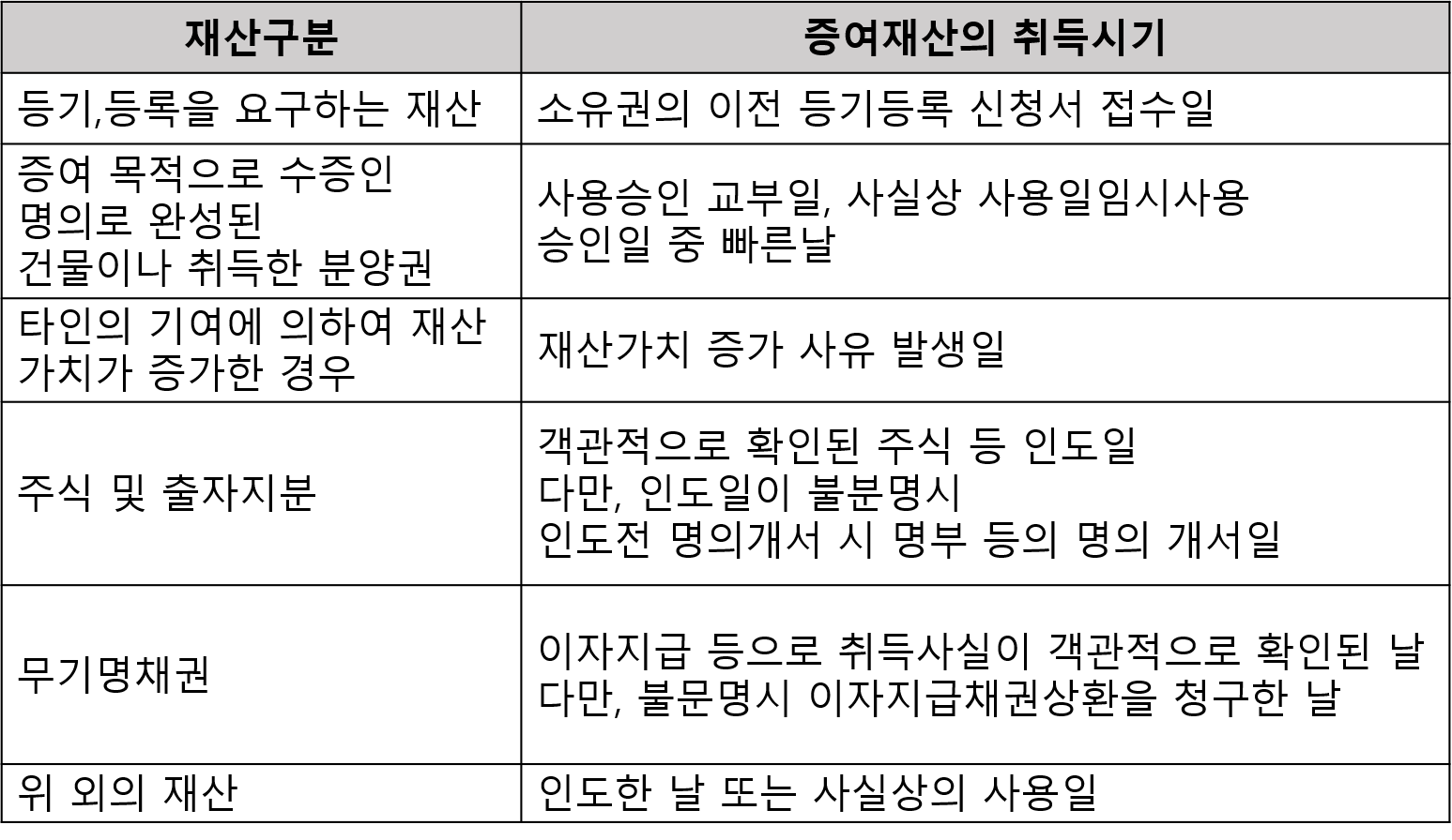 증여일로 보는 증여재산 유형별 취득시기는 다음과 같습니다.