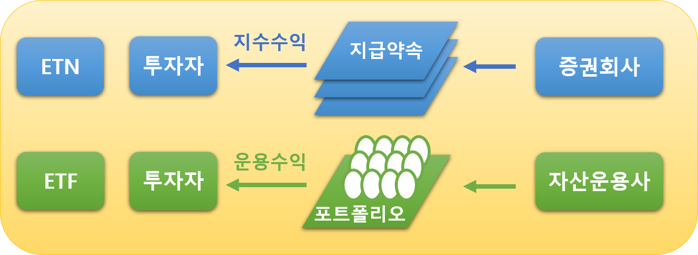 ETN은 증권회사가 무담보 신용으로 발행하는 데 반해, ETF는 자산운용사가 발행합니다.