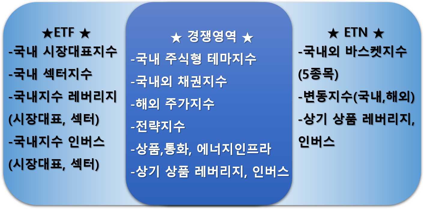 금융 시장에 안착한 ETF 시장의 상품 특성과 기초자산별 경쟁 현환을 고려하여 ETN 신상품을 공급함으로써 자산관리의 시너지를 창출하기 위한 목적입니다.