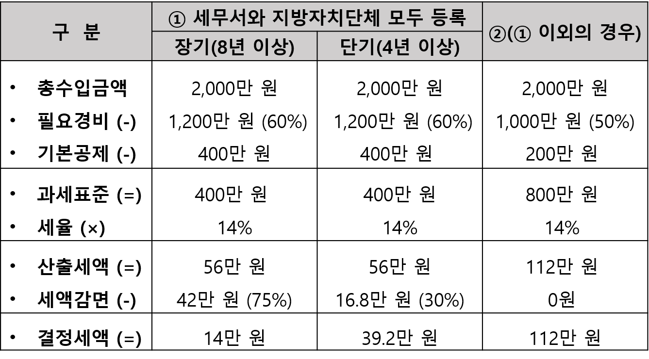 ⇒ 사업자등록 등 우대요건을 충족한 경우 결정세액은 14만 원(장기), 39.2만 원(단기)으로 등록하지 않은 경우의 112만 원 보다 유리(소득세만 비교한 결과임.)