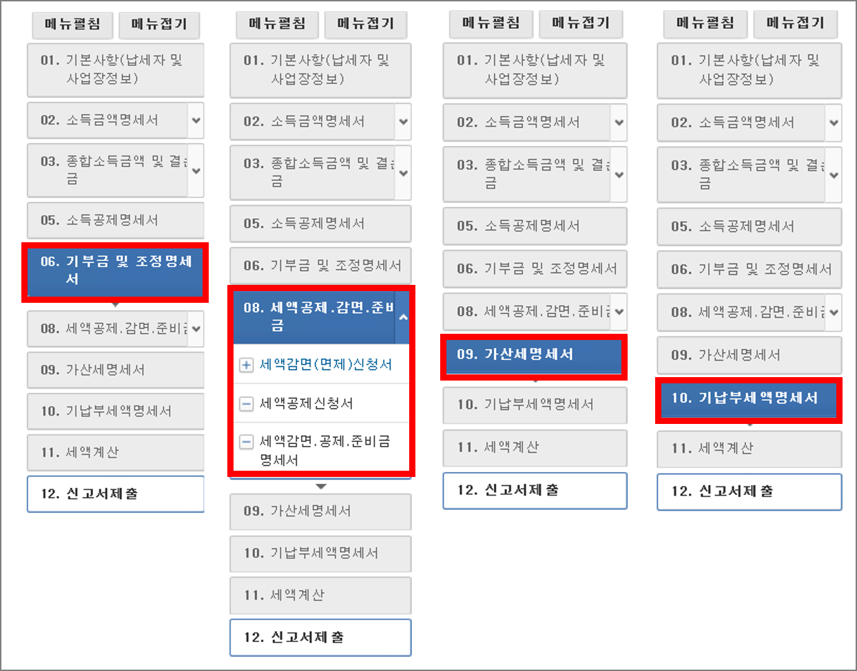 ④ [10. 기납부세액세액명세서] 에서 사업소득 또는 근로소득에서 원천징수 된 소득세 및 농어촌특별세(=기납부세액)을 확인합니다. 당해 귀속년도분에 대해 11월에 중간예납세액이 있는 경우에는 자동입력 해 줍니다.