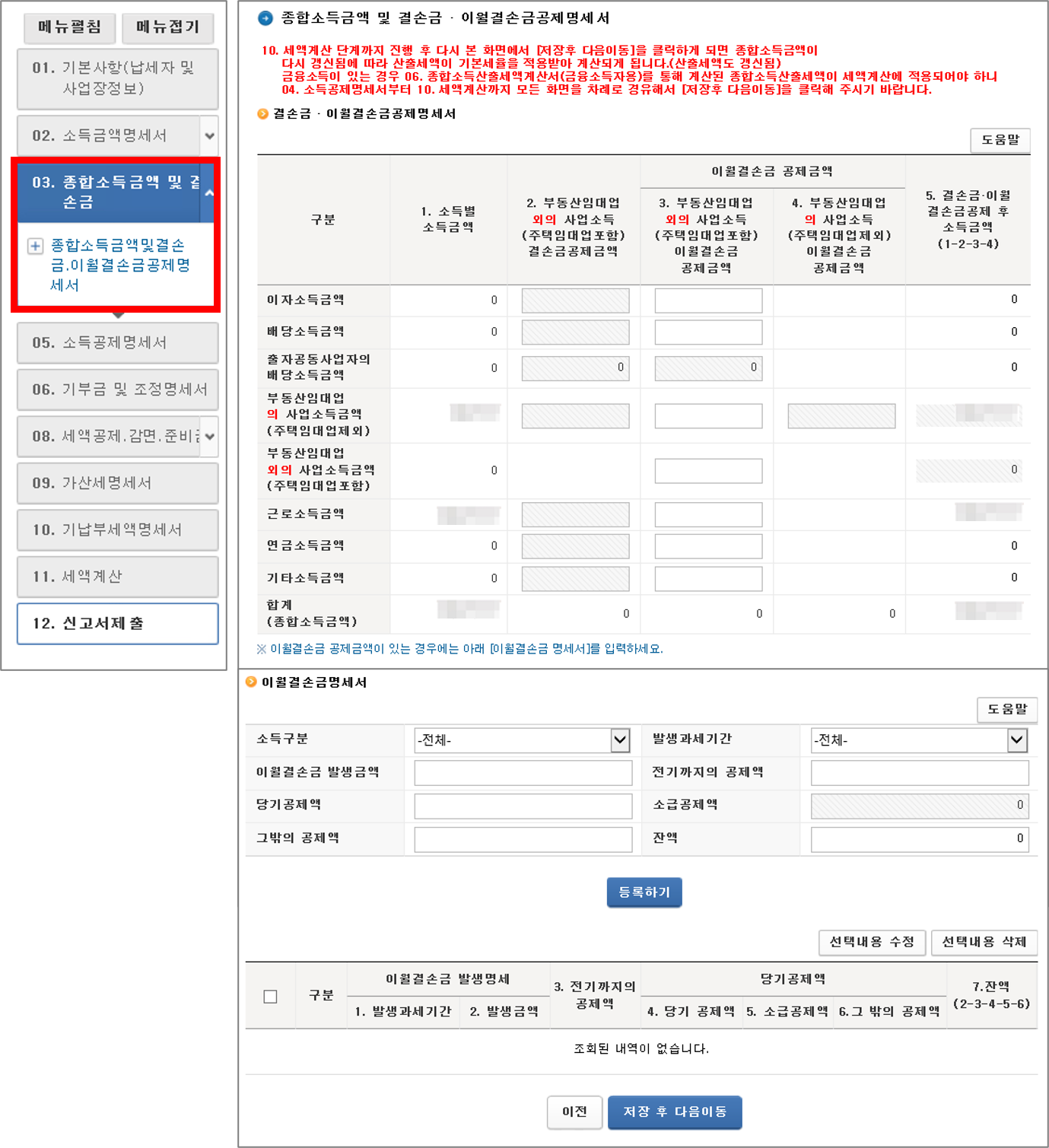 ① [03. 종합소득금액, 결손금 메뉴의 종합소득금액 및 결손금․이월결손금 공제명세서] 에서 입력한 사업소득금액과 근로소득금액을 확인합니다.
