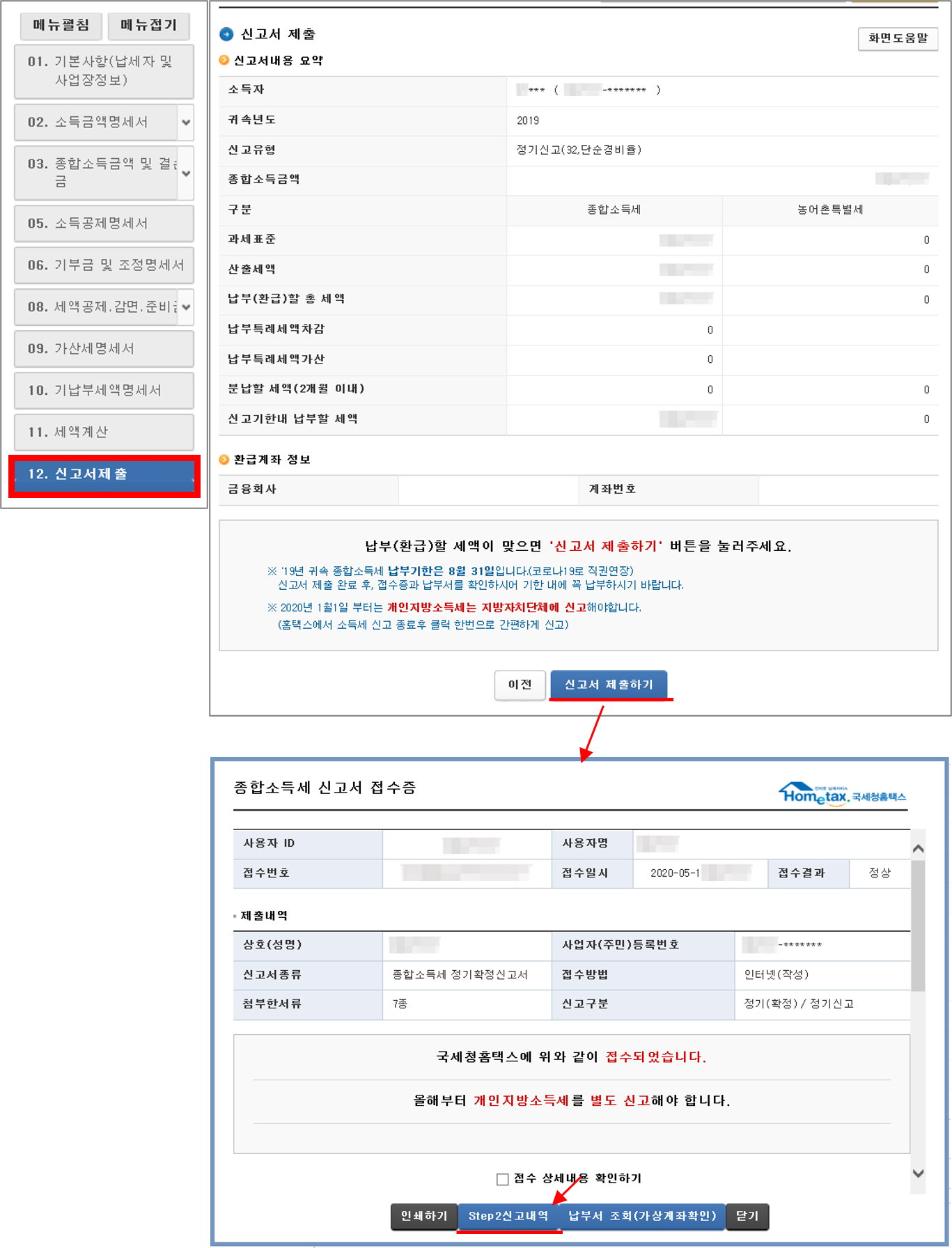 ⑥ 차감납부할세액이 양수로 납부할세액이 발생되면, [Step2. 신고내역] 종합소득세와 지방소득세 납부서도 출력할 수 있으며, 신고서 및 접수증도 출력할 수 있습니다.