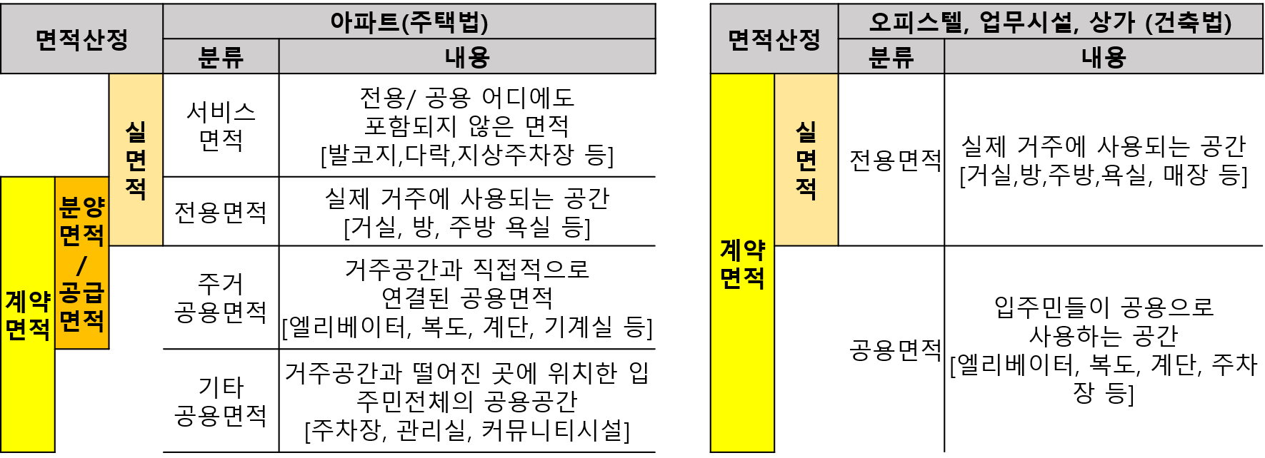 그래서 공급되는 면적 기준이 달라지게 됩니다. 아파트는 주택법에 적용을 받으며, 오피스텔은 건축법에 적용을 받습니다.