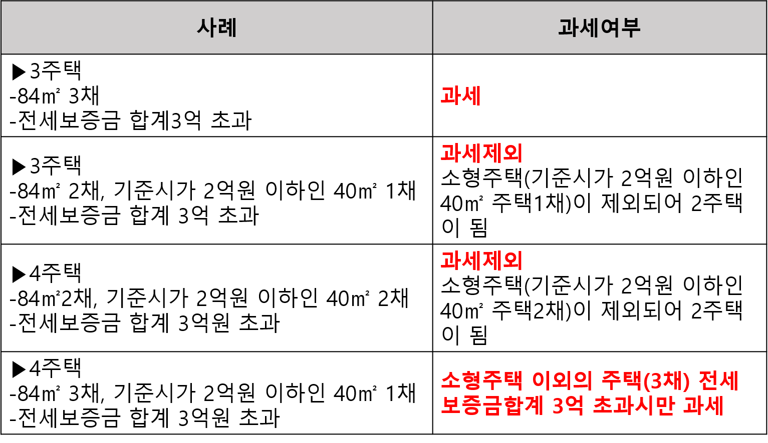 간주임대료 과세대상은 부부 합산 3 주택 이상 보유한 가구이며, 전용면적이 40㎡ 이하이면서 기준시가가 3억 원 이하인 주택의 경우 주택 수 계산에서 제외됩니다.