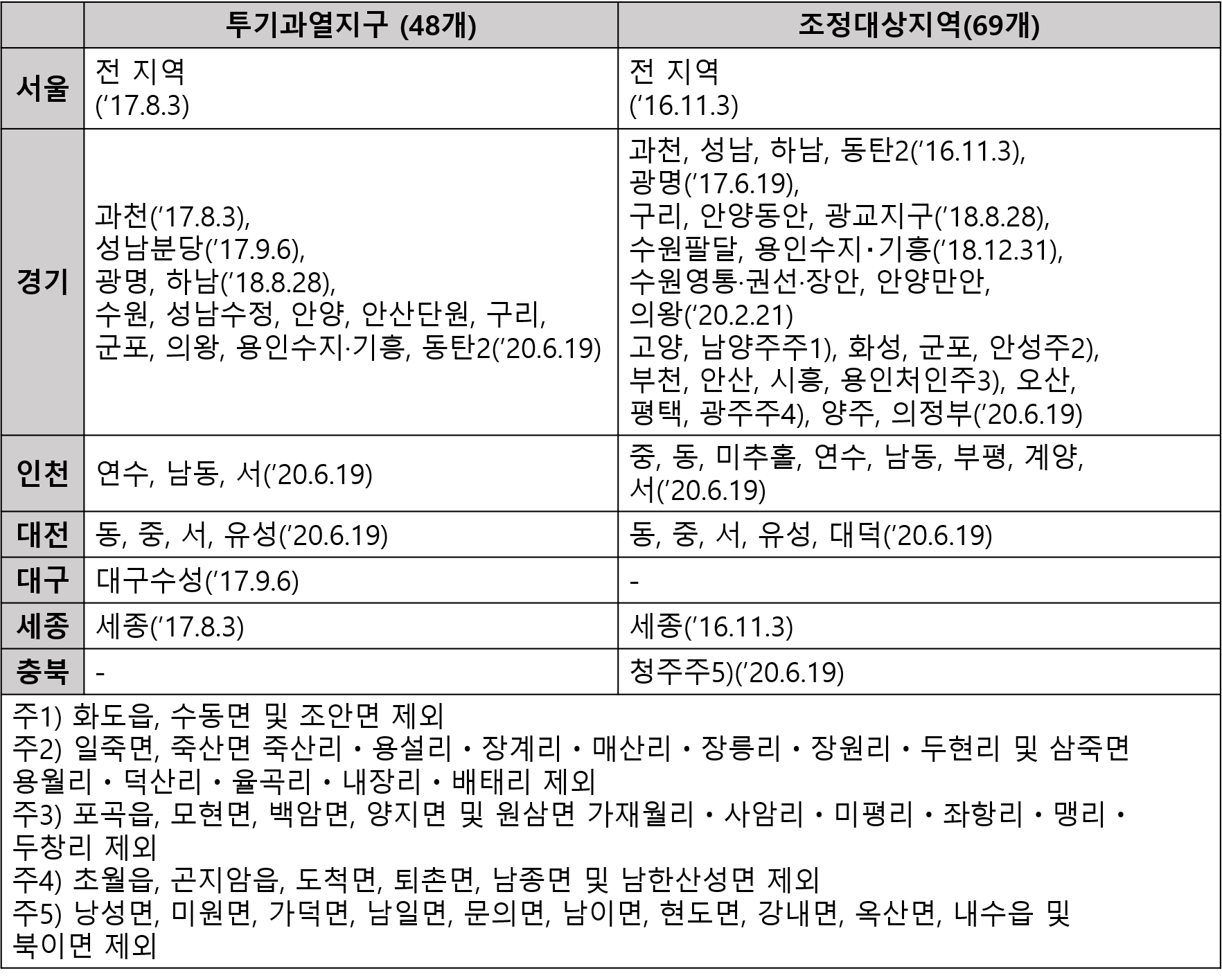 ※ 조정대사지역. 투기과열지구 지정 현황표('20.6.19 기준)